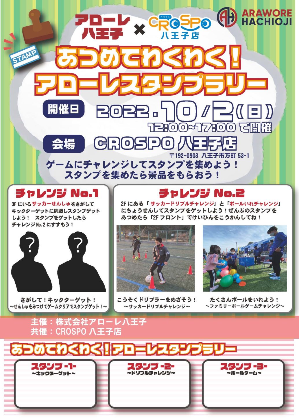当クラブは2022年10月2日(日)12:00より「クロスポ八王子」にてスタンプラリーイベント「あつめてわくわく!アローレスタンプラリー」を開催します。