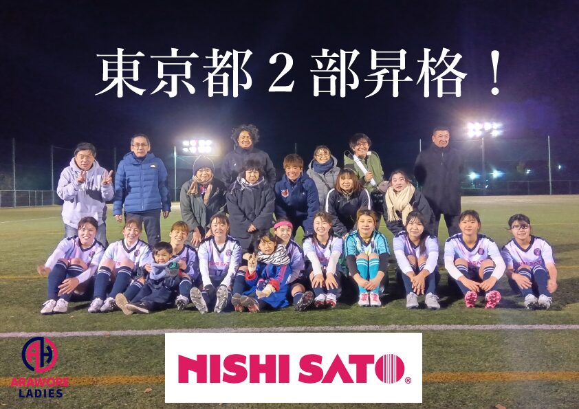 2024年12月8日(日)のリーグ戦勝利により、東京多摩地域から女性活躍を発信する創部1年目のチーム「NISHISATOアローレレディース」の東京都2部リーグ昇格条件である2位以内が確定しました。